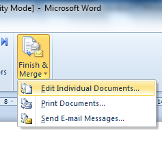Nihayet şablon belgemizden sonuç belgelerimiz oluşturma kısmına geldik. Bunun için “Finish Merge” menüsünden dökümanların yazıcı çıktısını almak istiyorsanız “Print Documents” seçilir. Oluşan yazıyı listedeki herkese ayrı ayrı mail olarak göndermek istiyorsanız “Send E-mail Messages...” seçilir. Mail göndermek için tabiki Kime (To : ) alanına eşleyebileceğiniz mail adreslerinin listenizde kayıtlı olması gerekir. Biz bu örnekte otomatik belge çoklaması yapmak istiyoruz o yüzden menünün en üstündeki “Edit Individual Documents...” menüsünü seçiyoruz.